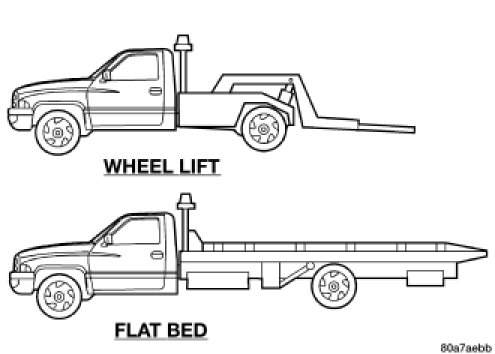 A vehicle equipped with SAE approved wheel lift-type towing equipment can be used to tow all vehicles. When towing a 4WD vehicle using a wheel-lift towing device, use tow dollies under the opposite end of the vehicle. A vehicle with flatbed device can also be used to transport a disabled vehicle.