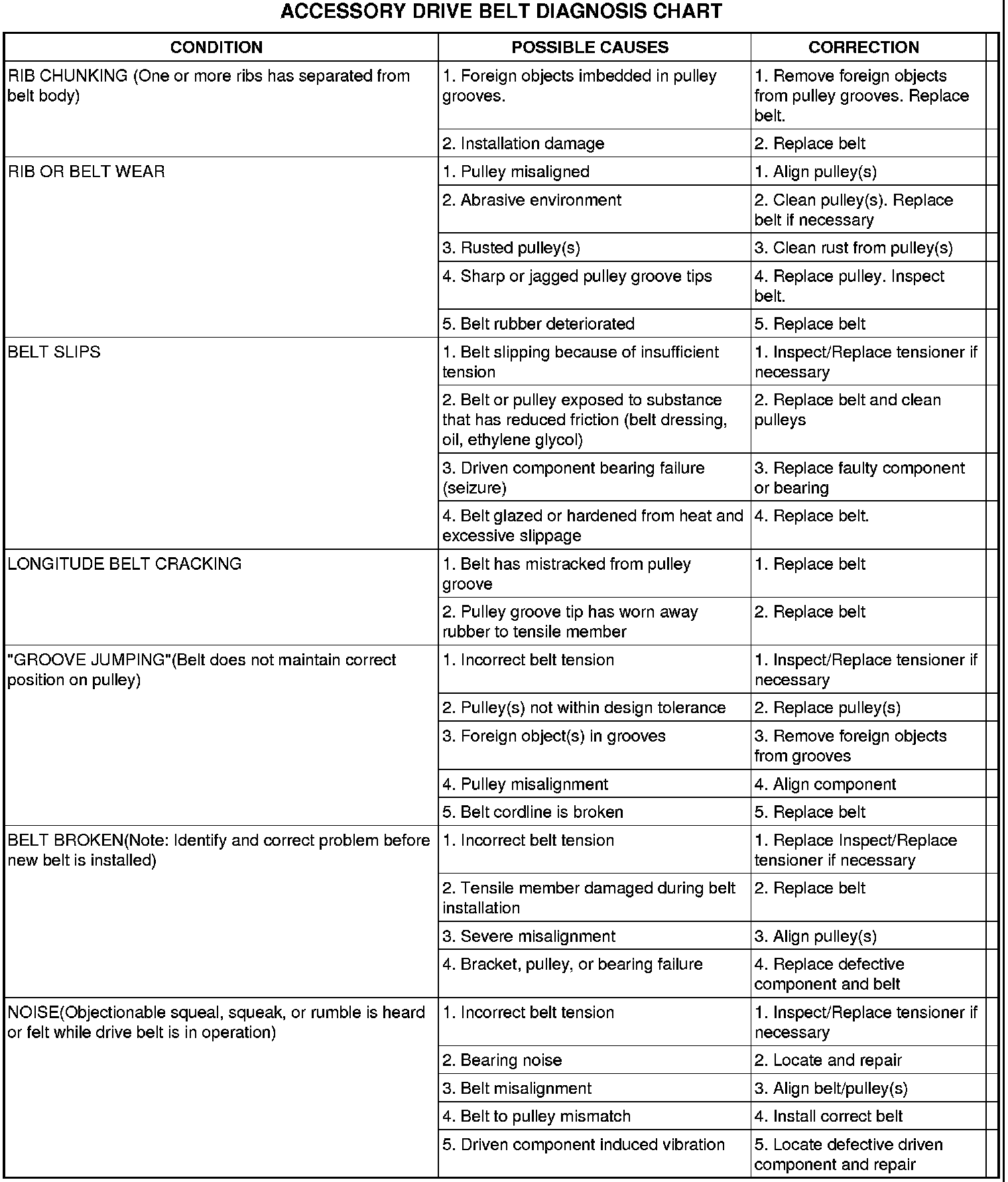 Noises generated by the accessory drive belt are most noticeable at idle. Before replacing a belt to resolve a noise condition, inspect all of the accessory drive pulleys for alignment, glazing, or excessive end play.