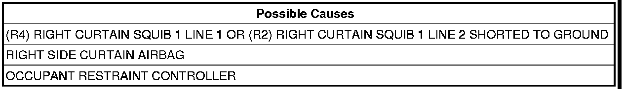 - Repair (R4) Right Curtain Squib 1 Line 1 or (R2) Right Curtain Squib 1 Line 2 shorted to ground.