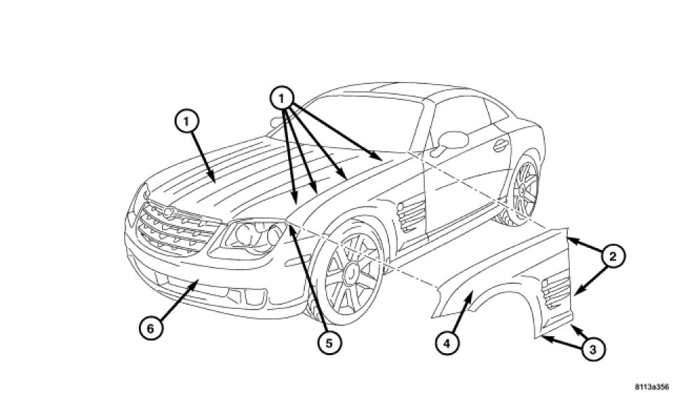 5. Install the bolts (2) on the fender attaching it to the A-pillar.