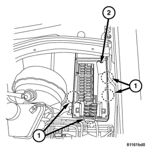 2. Install the underhood accessory fuse block cover panel (2) and secure it by snapping the retention tabs (1) into place.
