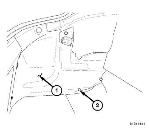 2. Remove the left trunk trim panel (1), by removing the plastic retainers (2) and lifting the left trunk trim panel out of the trunk.