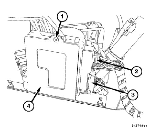 5. Remove the power top control module from the hydraulic pump bracket (4).
