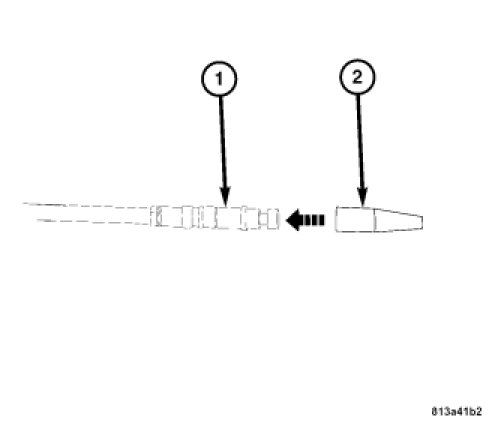 2. Slide the cone mechanism of Special Tool 9108 (2) onto the coupling end of the hydraulic line (1).