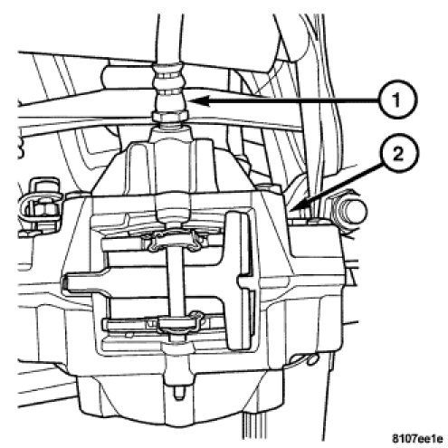 4. Install the brake hose (1) to caliper (2) by holding the brake hose (1) with a wrench and rotating caliper (2) until snug. Fully tighten the brake hose after the caliper is installed.