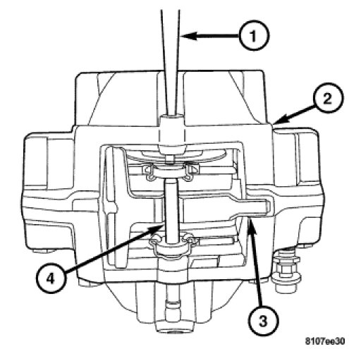3. Install the retaining pin (4) through the hole in the side of the caliper (2). Tap the pin (4) into the caliper (2) until it is threaded through both brake pads and over the anti-rattle clip (3).