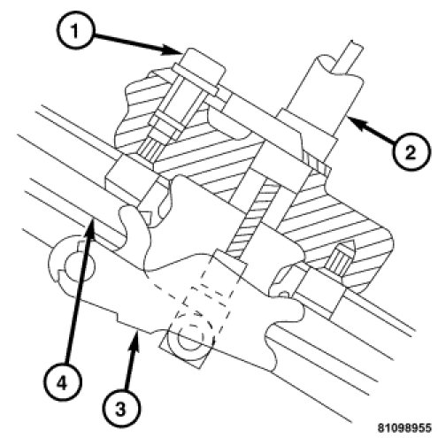 Parking brake cable (2) adjustment is controlled by the cable equalizer mechanism (1). The rear cables (2) are attached to the equalizer which uses a return spring to maintain tension and slides on the body. The front cable (5) is bolted to the equalizer (1) and the parking brake lever. The equalizer tensioner bolt (3) is used to take up the slack in the cables and as a final adjustment to the parking brake system.