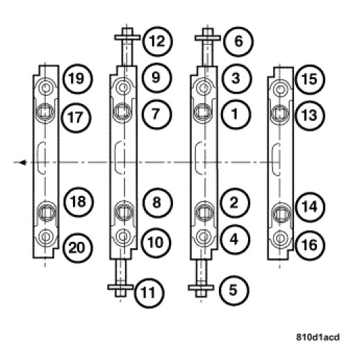 1. Follow the torque sequence shown for the crankshaft main bearing journal cap bolts.