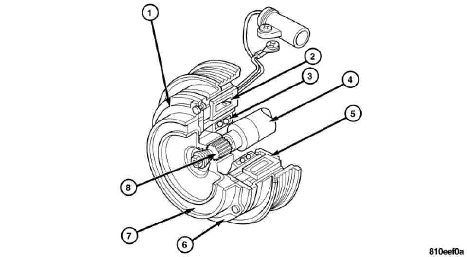 The pulley (1) on the A/C compressor drive shaft (4) is driven by the poly-V-belt. The clutch turns on the ball bearing (3) around the magnetic coil (5) fastened to the A/C compressor housing. The pressure plate (6) with rubber insert (7) is connected to the A/C compressor drive shaft (4) by splines (8) allowing it to move in the axial direction.