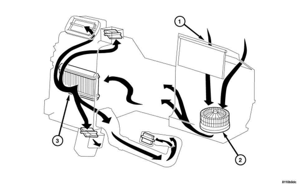 Engine coolant is circulated through heater hoses to the Heater Core (3) at all times. As the coolant flows through the Heater Core (3), heat removed from the engine is transferred to the Heater Core fins and tubes. Air directed through the Heater Core picks up the heat from the Heater Core fins. The temperature control door allows control of the heater output air temperature by controlling how much of the air flowing through the HVAC housing is directed through the Heater Core (3). The blower motor (2) speed controls the volume of air flowing through the HVAC housing.