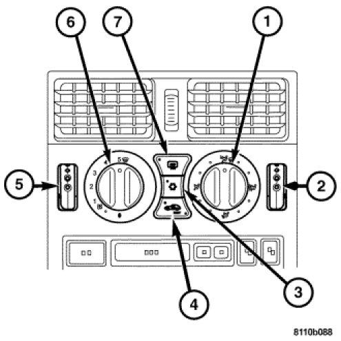 2. Set the A/C Heater mode control switch knob (2) in the Panel position, the temperature control knob (7) in the full cool position, the A/C button in the On position, and the blower motor switch knob (6) in the highest speed position.