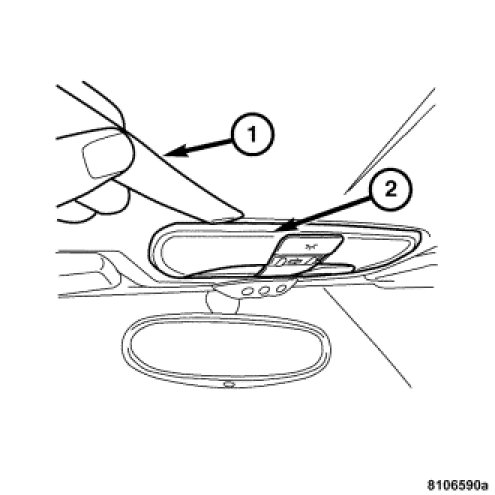 2. Using a trim stick (1), gently pry down and away from the courtesy lamp switch/unit body (2) to release the lens cover.