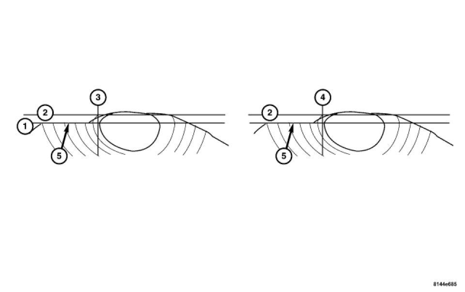 With the horizontal centerline of the headlamp (line 2) transferred on the wall, measure down 53 mm (2.1 in). This new line (line 1) will be the vertical aiming mark. Using the left side of the headlamp vertical centerline (line 3 for left headlamp and line 4 for right headlamp), adjust the headlamp unit so the residual light from the headlamp, not the hot spot, is even with the line (line 1) that was marked previously 53 mm (2.1 in) below the horizontal centerline (line 2). The ideal alignment should be (line 5).