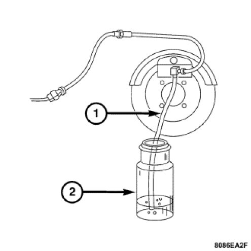 3. Attach one end of the bleed hose (1) to the bleed screw and insert the opposite end in a glass container (2) partially filled with brake fluid. Be sure the end of the bleed hose is immersed in the brake fluid.