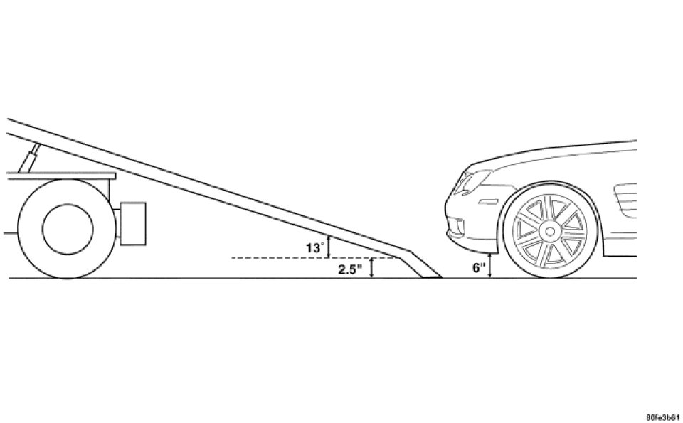 Flat bed towing should be the only method used for the Chrysler Crossfire. The flat bed must have an approach angle less then 13.3° or something must be used (such as wood slats) to raise the overall height of the vehicle during loading.