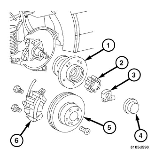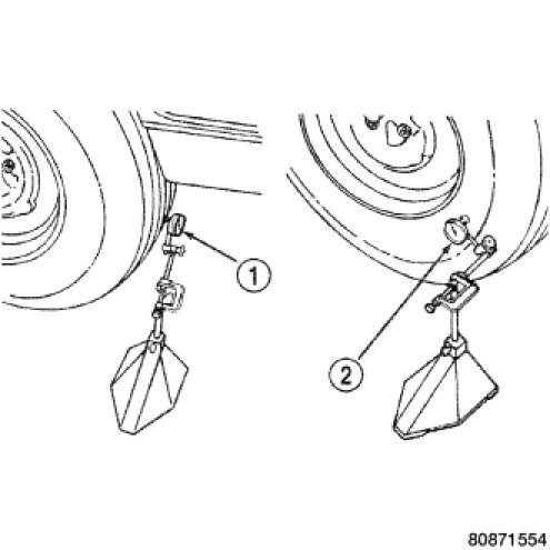 Lateral runout (1). This is measured by using a dial indicator (1) on the inner portion of the wheel (6) rim.