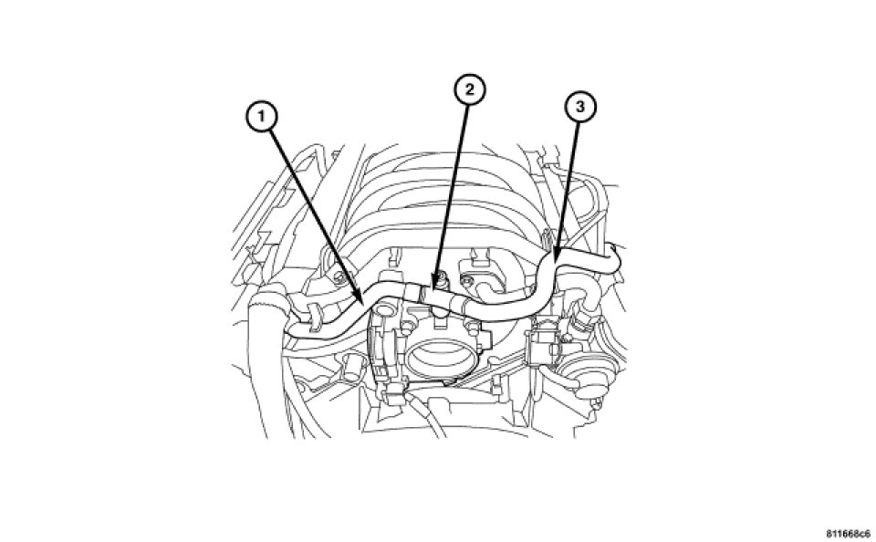 3. Blow compressed air through each tube (1 and 3) and the draft-tube style insert (2). Check for blockage or restrictions. If cleaning is necessary, spray a soapy-type all-purpose cleaner into each component and blow out. After restriction is cleared, rinse out component with clear water. Blow water from component and install to vehicle. To prevent damage to plastic components, never spray carburetor-type cleaner into any of the plastic tubes.