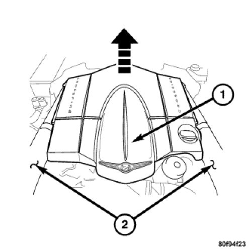 7. Install the engine cover (1). Align the engine cover retaining clips to the rubber mounts, and push down firmly to connect engine cover to rubber mounts.