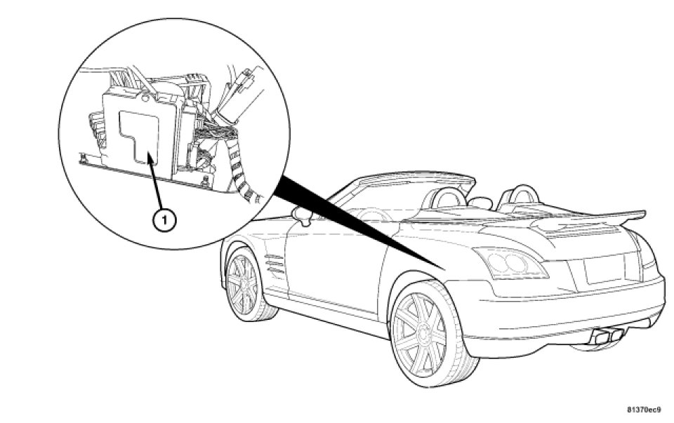 The Power Top Control Module (PTCM) (1) is located in the trunk below the left rear tail light assembly and next to the power top hydraulic assembly.