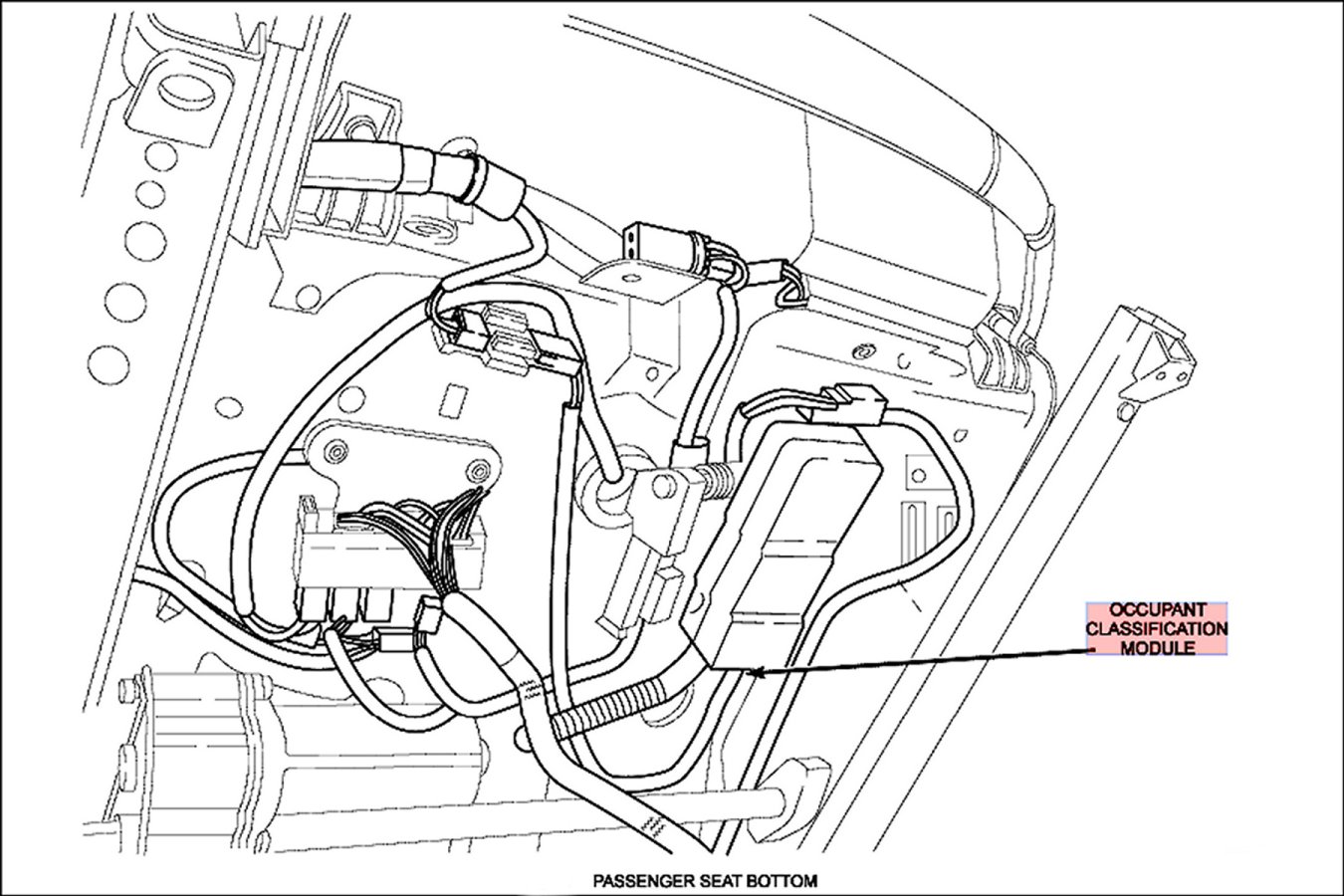 The Occupant Classification Module (OCM) is located under the passenger seat cushion.