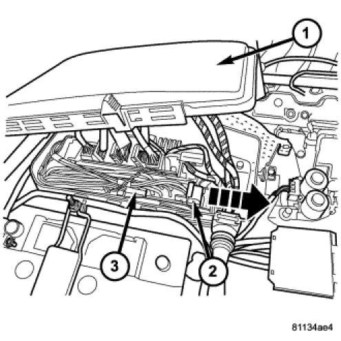 5. Unlock and disconnect the wiper motor harness connector (2) from the Body Control Module (BCM) (3).