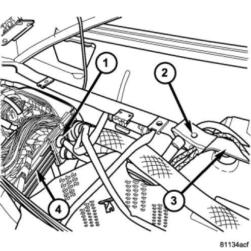 9. Remove the lower wiper module attachment bolt (3) under the cowl ledge (2).