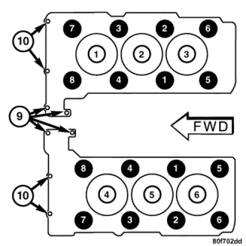 NOTE: Bolts numbered 9 and 10 are timing chain cover bolts. They should be tightened after the cylinder head bolts are tightened.