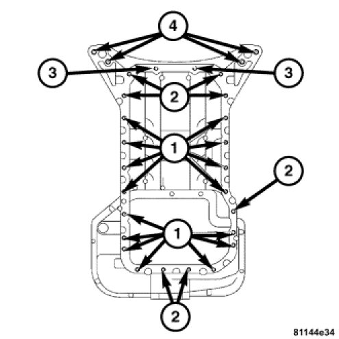 1. Install the oil pan bolts with the proper size and length bolt in the correct bolt hole.