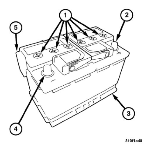The factory-installed low-maintenance battery has removable battery cell caps (1). Distilled water can be added to this battery. The battery is not sealed and has a vent (5). The chemical composition of the metal coated plates within the low-maintenance battery reduces battery gassing and water loss, at normal charge and discharge rates. Therefore, the battery should not require additional water in normal service. If the electrolyte level in this battery does become low, distilled water must be added. However, rapid loss of electrolyte can be caused by an overcharging condition. Be certain to diagnose the charging system after replenishing the water in the battery for a low electrolyte condition and before returning the vehicle to service. Description.