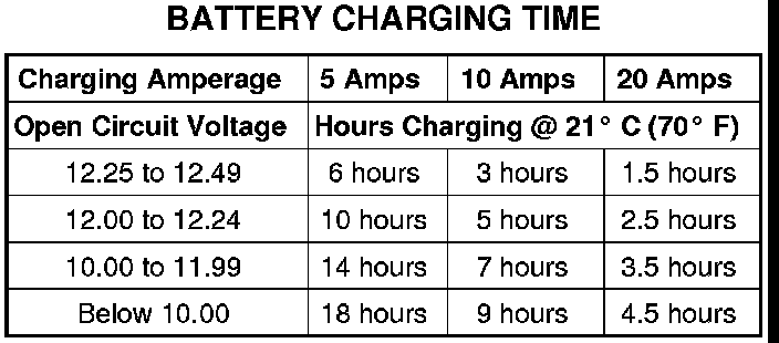 The Battery Charging Time Table gives an indication of the time required to charge a typical battery at room temperature based upon the battery state-of-charge and the charger capacity.