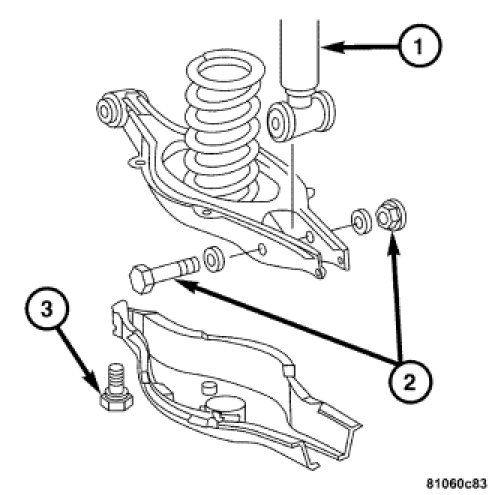 1. Install the bolt attaching the rear lower control arm (4) to the rear wheel carrier. Tighten to 70 Nm (52 ft. lbs.)