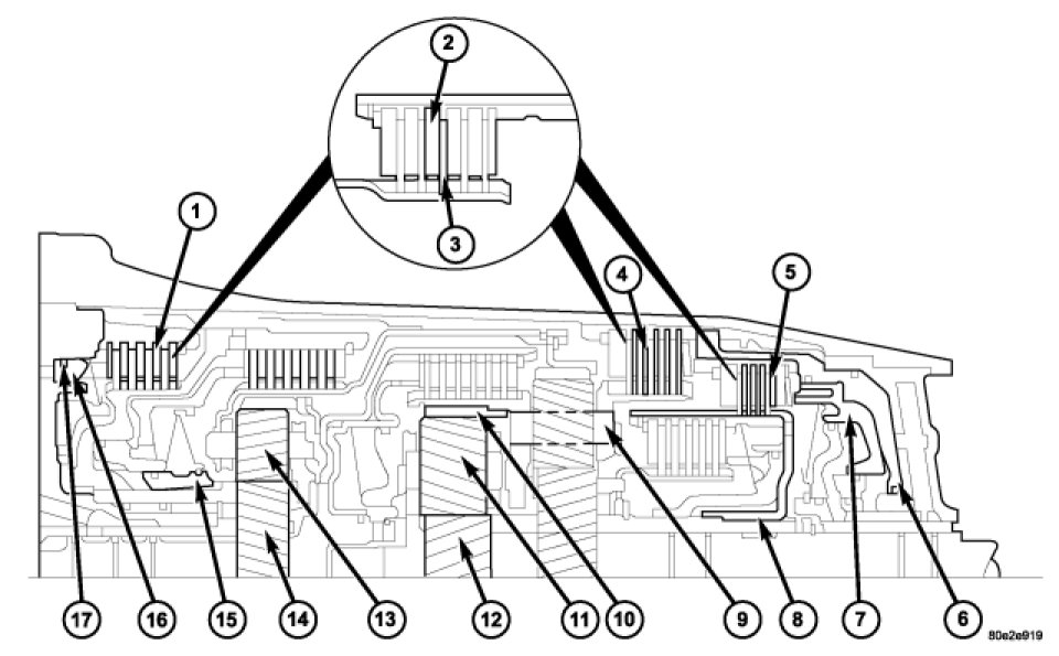 Three multiple-disc holding clutches, the front, B1 (1), middle, B3 (4), and rear multiple disc clutches, B2 (5), are located in the planetary gear sets in the transmission housing.