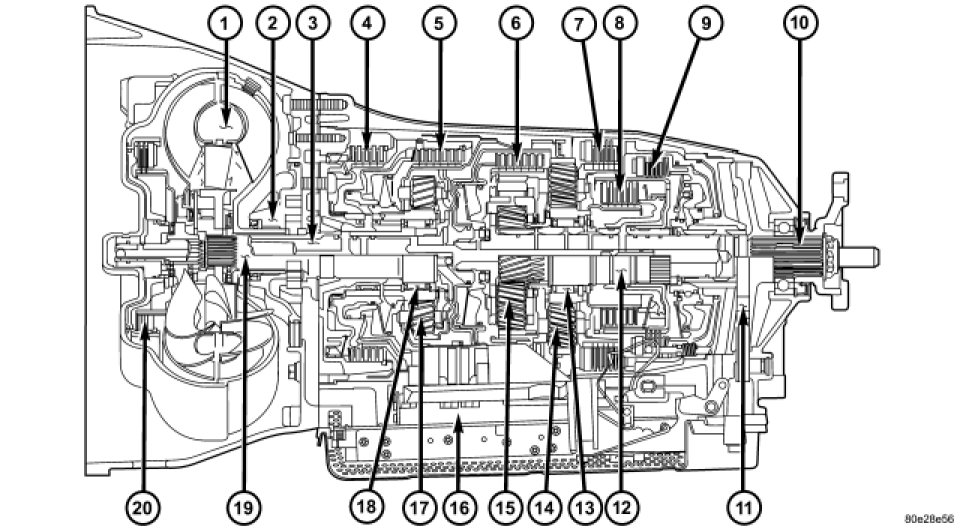 Freewheeling clutches F1 and F2 are used to optimize the shifts. The front freewheel, F1, is supported on the extension of the stator shaft on the transmission side and, in the locking direction, connects the sun gear of the front planetary gear set to the transmission housing. In the locking direction, the rear freewheeling clutch, F2, connects the sun gear of the center planetary gear set to the sun gear of the rear planetary gear set.