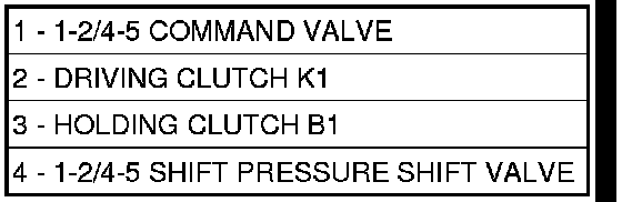 The shift pressure is determined by the shift pressure regulating solenoid valve and the shift pressure regulating valve (1). In addition, pressure from the clutch K2 is also present at the annular surface of the shift pressure regulating valve. This reduces the shift pressure in 2nd gear.
