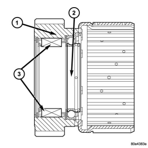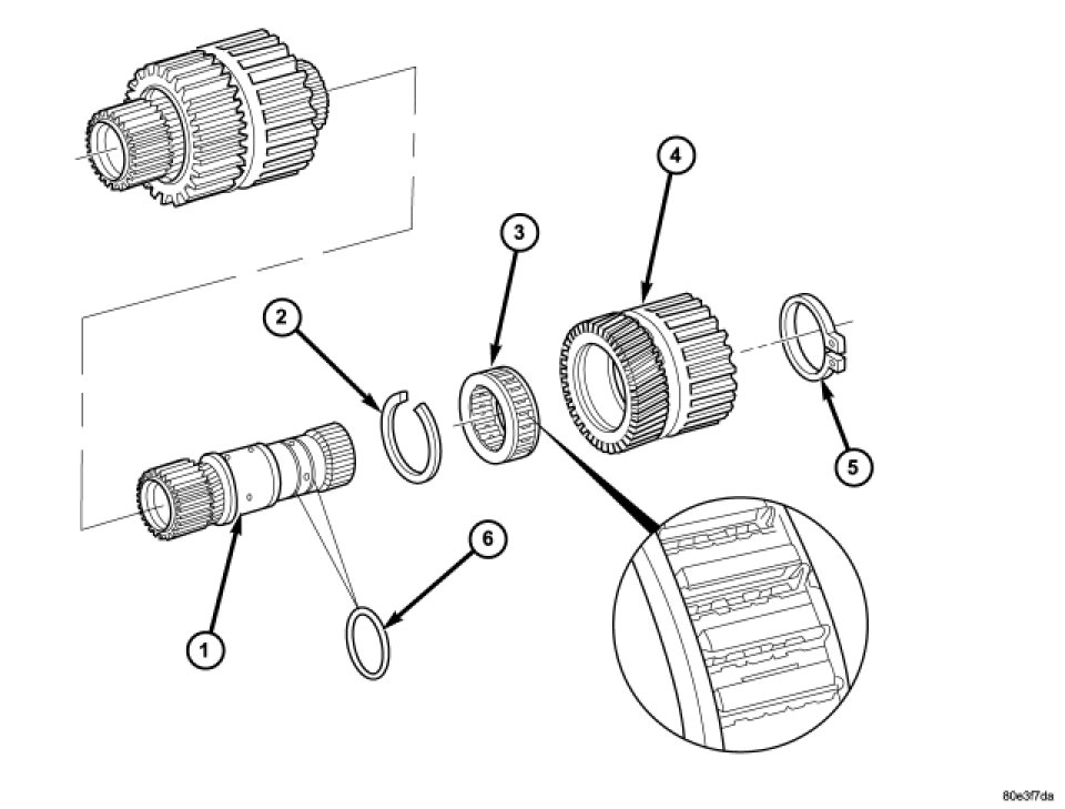 6. Check the anti-friction bearing (2) in the rear planetary sun gear for damage. Replace as necessary.