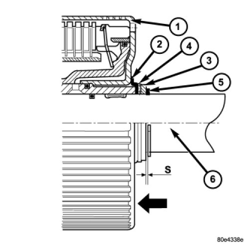 8. Inspect axial play between shim (10) and retaining ring (11). Check axial play "S" between shim (10) and retaining ring (1) using a feeler gauge. Clearance should be 0.15-0.6 mm (0.006-0.024 in.). Shims are available in thicknesses of 3.0 mm (0.118 in.), 3.4 mm (0.134 in.), and 3.7 mm (0.146 in.). Adjust as necessary