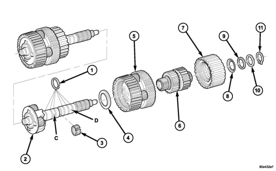2. Remove retaining ring (11), shim (10), thrust needle bearing (9) and thrust washer (8) from output shaft.