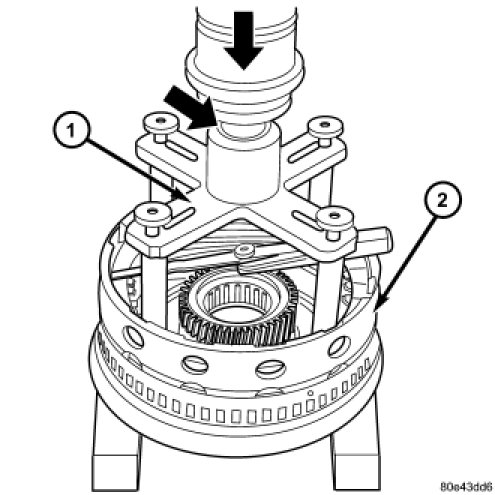 4. Place Multi-use Spring Compressor 8900 (2) on spring plate and compress the spring until the groove of the snap-ring (1) is exposed.