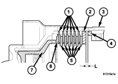 15. For transmissions using single sided friction discs, use a feeler gauge to determine the play "L" at three points between the snap-ring (4) and outer multiple-disc (2).