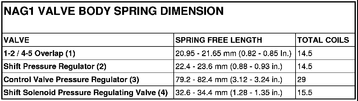 4. Lubricate and install the 1-2 / 4-5 Overlap Regulating Valve, Sleeve, and Piston assembly (1), Shift Pressure Regulating Valve assembly (2), Control Valve Pressure Regulator Valve assembly (3) and Shift Solenoid Pressure Regulating Valve assembly (4) into the valve body.