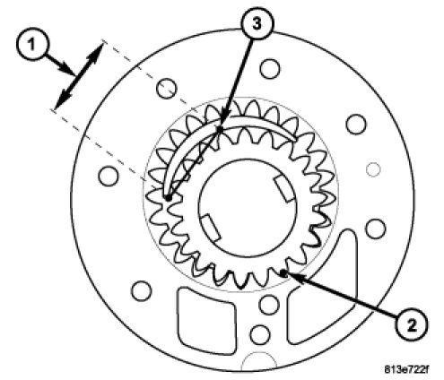 Tip clearance for the inner gear can be checked by moving the inner gear into tight mesh (2) with the outer gear as shown. Clearance between the ID of the crescent feature of the housing and the OD of the teeth of the inner gear (3) should then me measured at a point 37 mm from the corner of the crescent (1) feature, as shown below.