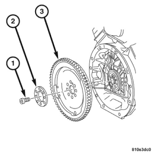 2. Install the spacer (2) and new flywheel bolts (1).