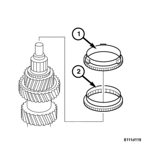 2. Install the clutch body (2) and the synchronizer ring (1).