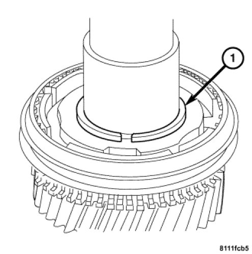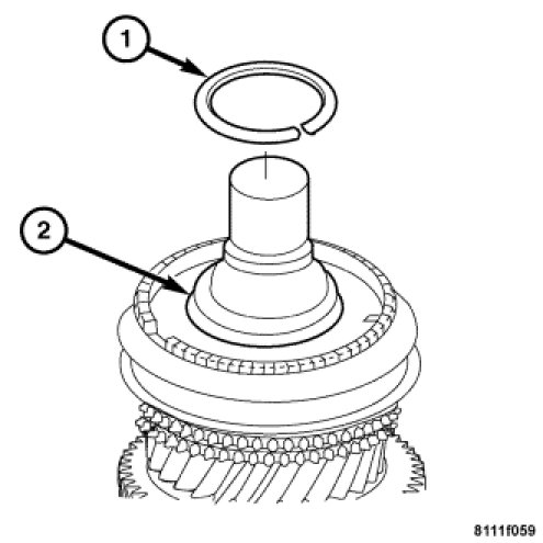 5. Install the snap ring (1) on the mainshaft (2). Check that it is fully seated.