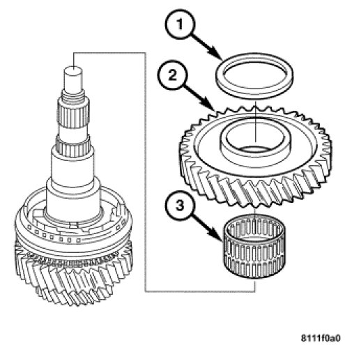 16. Install the first gear needle bearing (3), first gear (2), and press on the 1st gear thrust washer (1).