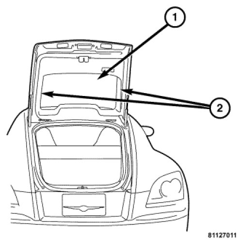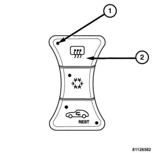 When the Rear Window Defogger Switch (2) is pressed with the Ignition Switch turned to the ON/RUN position, electrical current from Fuses 25 and 26 in the Underhood Accessory Fuse Block is applied to the rear window defogger grid. An LED (1) in the push button switch illuminates when the rear window defogger is activated.