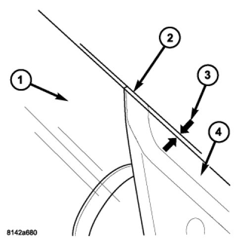 1. Raise the door glass (1) all the way up. There should be a 1 mm (0.04 in.) bulge (3) in the rubber above the upper edge (2) of the sealing mirror triangle (4).