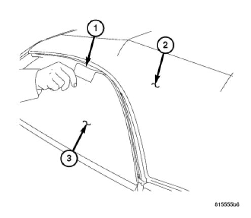 2. Using a feeler gauge (1), check the gap between from the top of the window (3) to the convertible top (2) when the door is latched in the first catch position. The gap must be at least 2 mm (.080 in.) from the upper edge of the glass to the convertible top as shown.