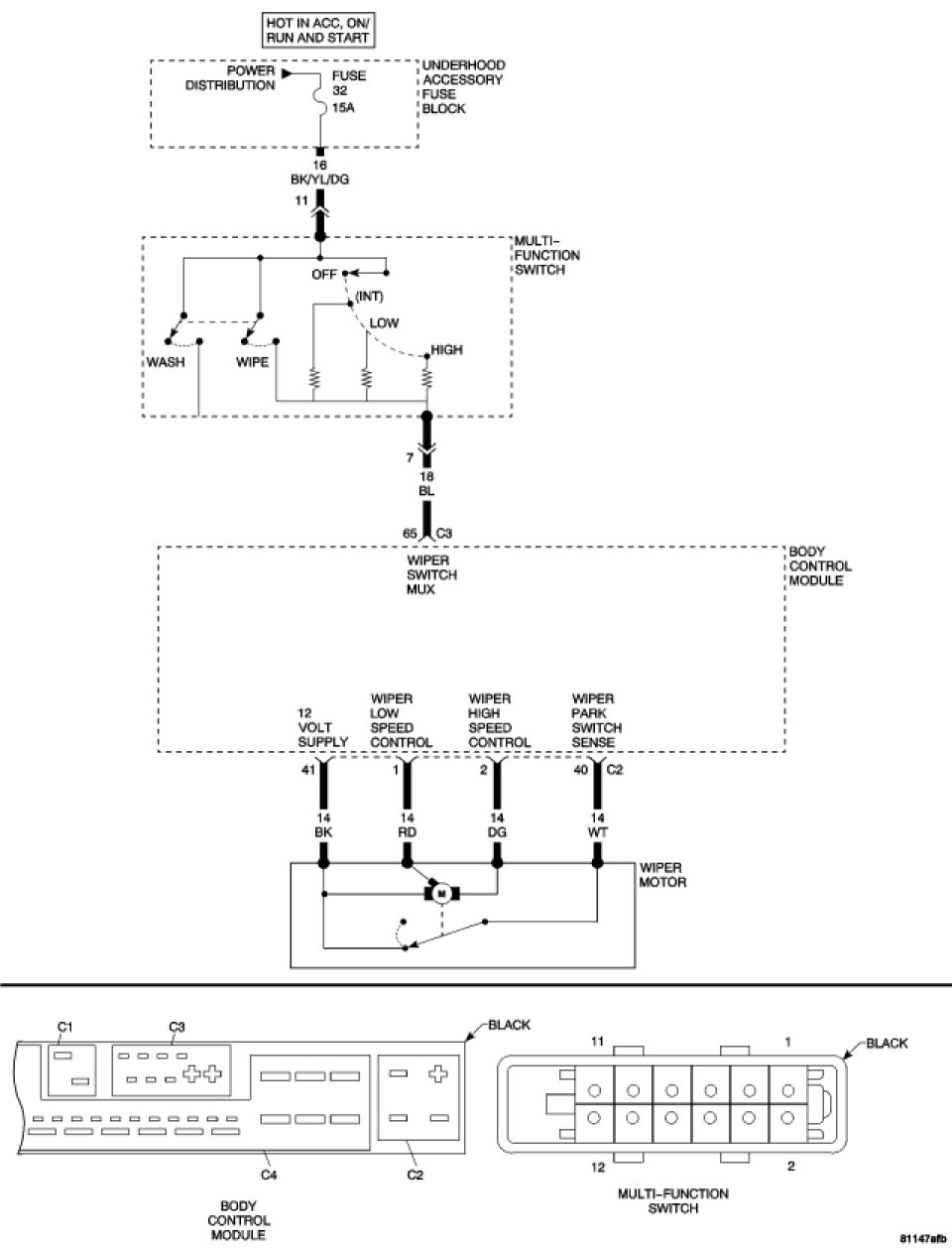 Measure the voltage of the Wiper Switch Mux circuit at the BCM C3 connector cavity 65 with the Wiper Switch in the High position.