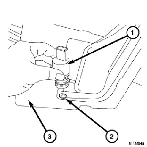 1. Insert the washer pump motor (1) into the rubber grommet (2) at the base of the washer reservoir (3).